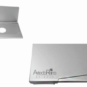 Porta cartão de alumínio, design da abertura em diagonal e com um furo central vazado na parte traseira.